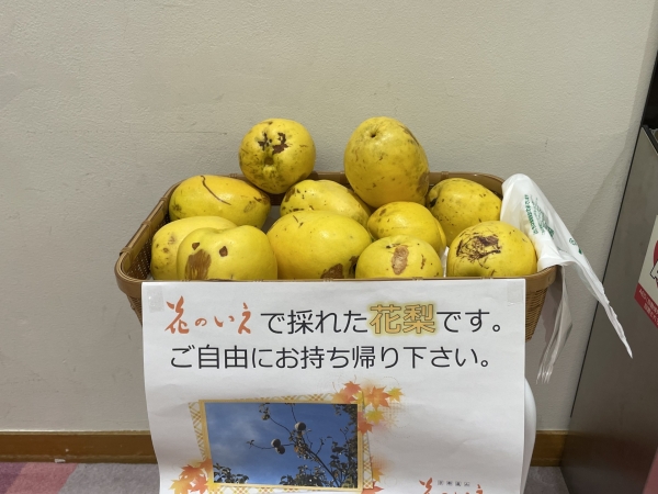 【花のいえ 玄関口】 【花のいえで収穫された花梨 ロビーにて】