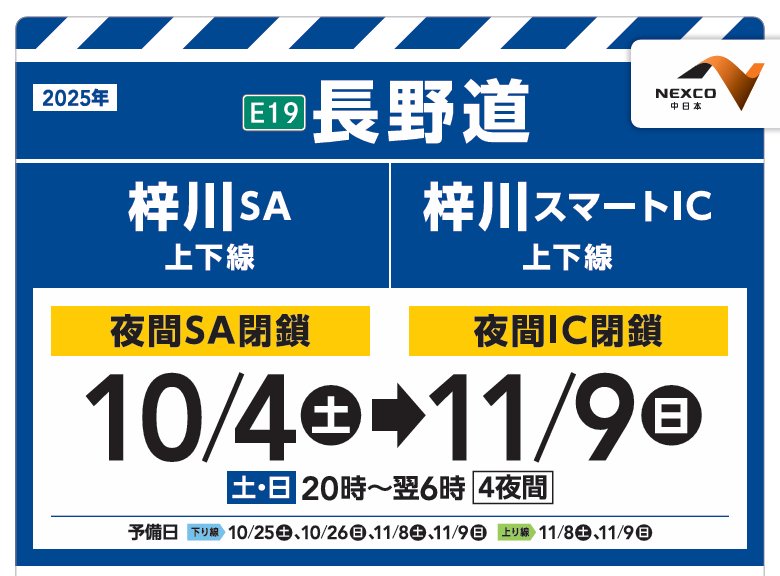 令和7年10月4日(土)~11月9日(日)の【土・日】20時~翌6時まで梓川SAと梓川スマートICが閉鎖されています。