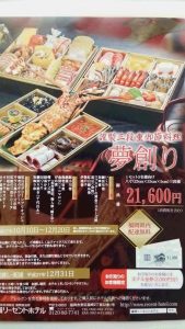 一セット5名様向け三段重が、一般様価格¥21.600で福岡県内は配達無料でございます。又、お引き取りのお客様には「ホテル金券(2.000円分)を進 呈いたします。