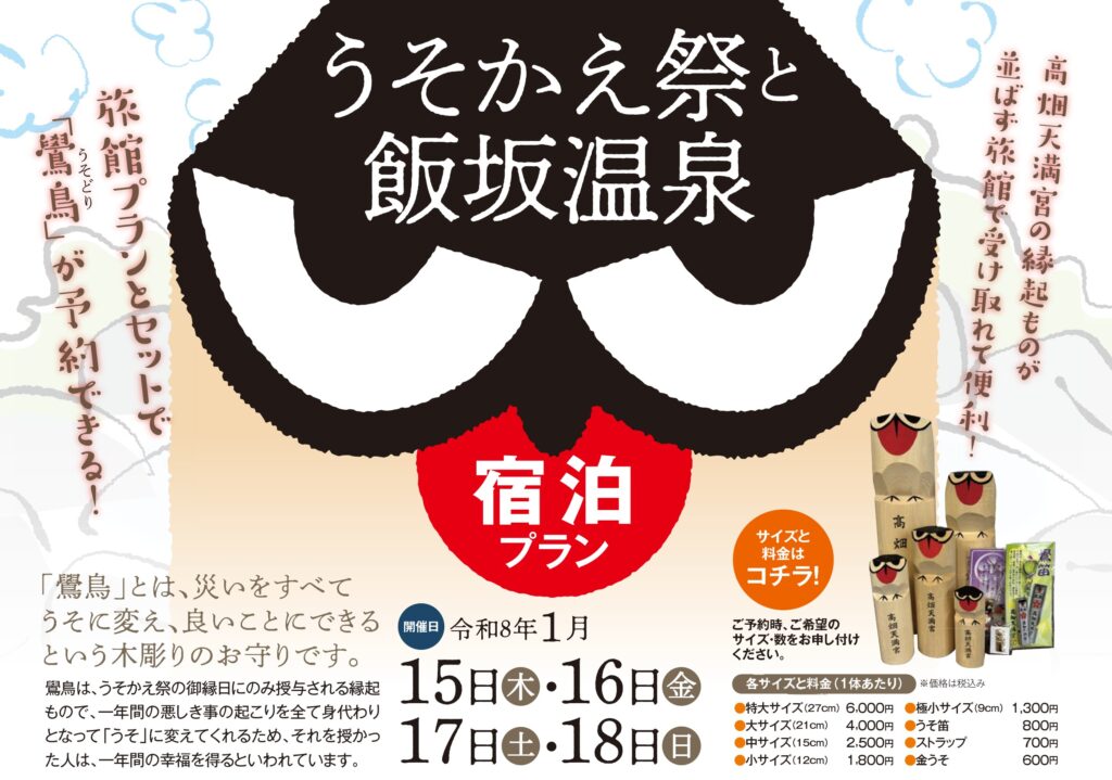 お電話のみの受付ではありますが、「うそかえ祭り」宿泊プランで申し込んで頂くと、高畑天満宮の縁起ものが、並ばず旅館で受け取れて便利です!