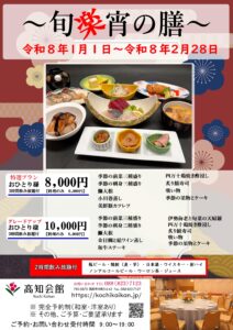宴会プラン・旬楽宵の膳 (2026年01月01日) 令和8年 1月1日 ~ 2月28日 お1人様8,000円~ 【2時間飲み放題付】 ※完全予約制 その他、ご予算・ご要望承ります ご予約・お問い合わせ受付時間 9:00 ~ 19:00